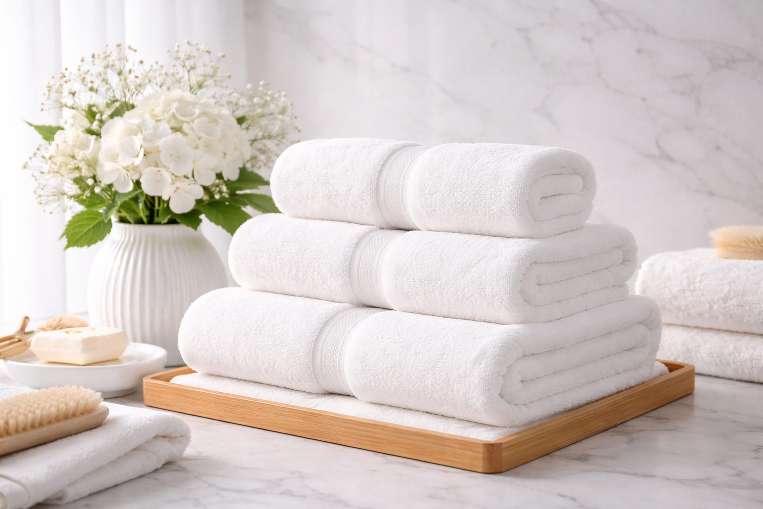 - High-quality white towels for premium hotels, hospitality chains, & institutions.
